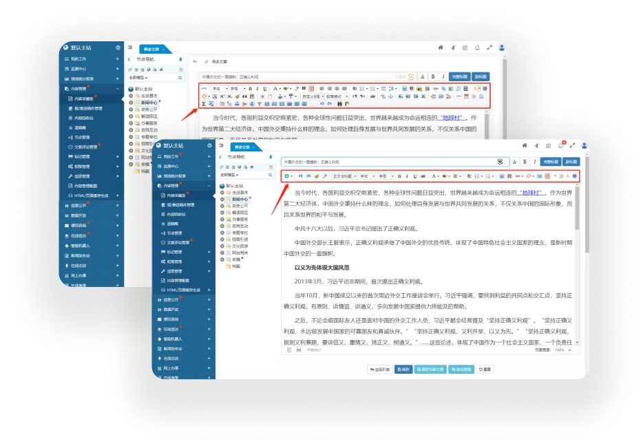 在線 HTML 編輯器是內(nèi)容管理系統(tǒng)的最核心功能之一,它采用與 Word 類似的可視化編輯方式,實現(xiàn)對文章內(nèi)容的“所見即所得”的在線編輯效果。