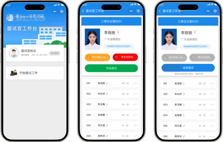 預約面試系統(tǒng)相比招考管理系統(tǒng),減少了組織筆試相關(guān)的功能模塊(如科目管理、考點管理、考場管理、座位管理、座位安排、筆試成績錄入等),也沒有面試日程表功能。但它增加了考生報到、查看排隊情況、以及叫號大屏幕等功能,專門針對大規(guī)模人員面試業(yè)務場景的需求進行了優(yōu)化。