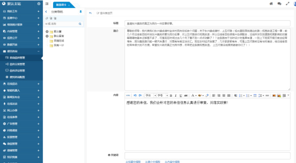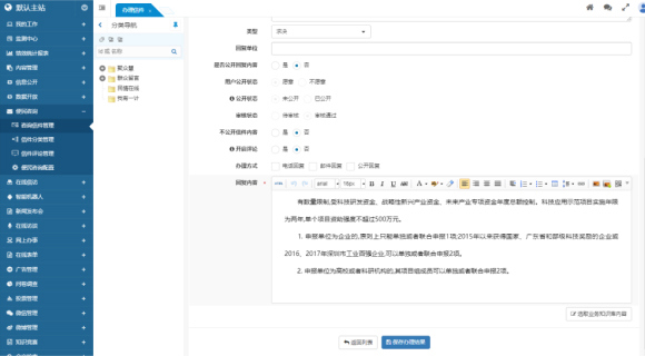 在回復(fù)留言、信件等互動信息時(shí),由于內(nèi)容需要體現(xiàn)業(yè)務(wù)知識和政府的公正形象,系統(tǒng)預(yù)先整合了大量經(jīng)典案例和回復(fù),形成一套業(yè)務(wù)知識庫。后臺處理人員在辦理和回復(fù)信件時(shí),可以方便地檢索業(yè)務(wù)知識庫,快速找到參考內(nèi)容,從而實(shí)現(xiàn)高效且高質(zhì)量的互動處理。