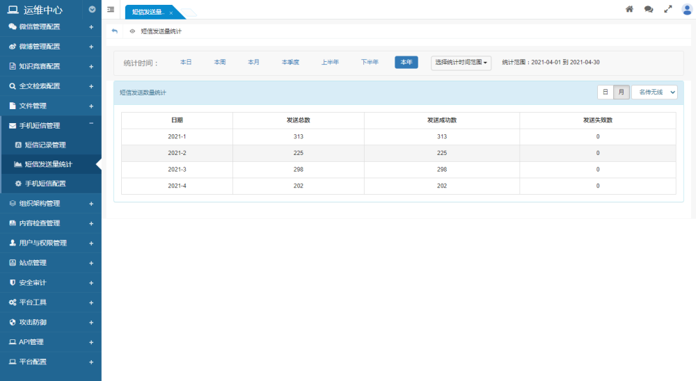 提供按日和按月兩種統(tǒng)計表。統(tǒng)計每日/每月發(fā)送的短信發(fā)送總量、發(fā)送成功數(shù)量、發(fā)送失敗數(shù)量。便于與短信服務(wù)商進行對帳。