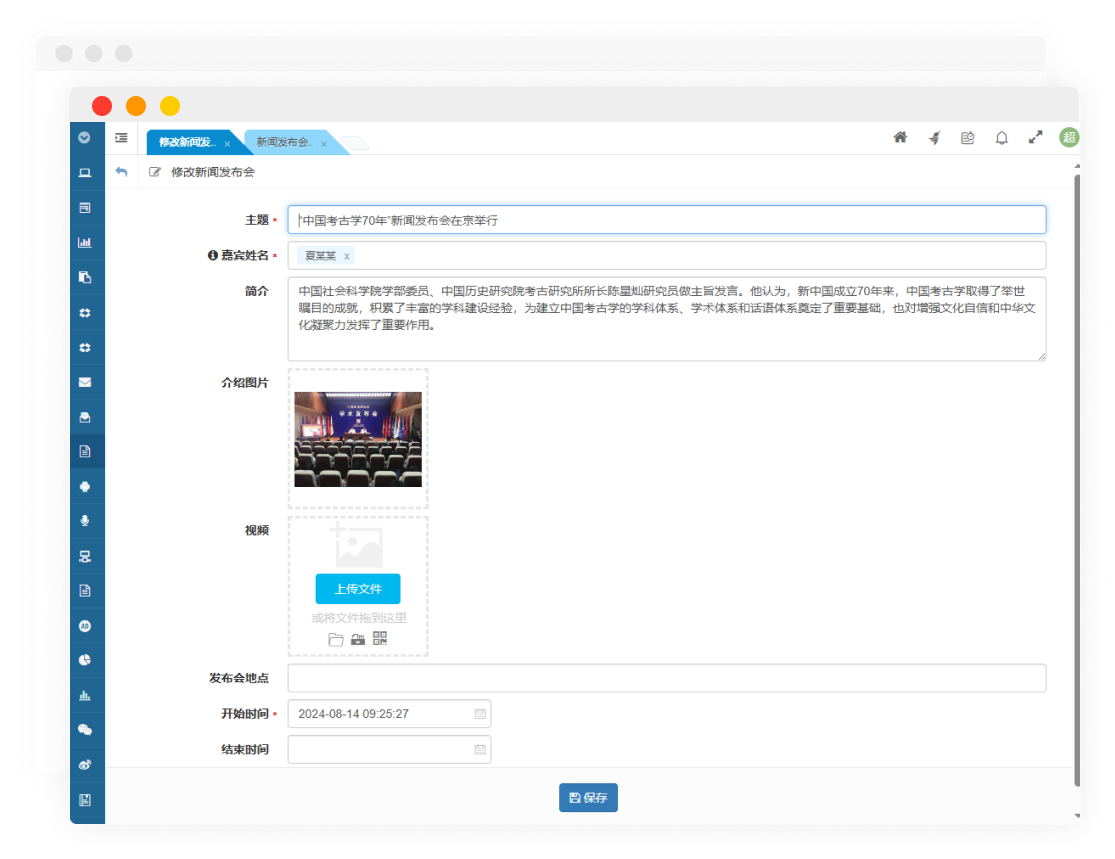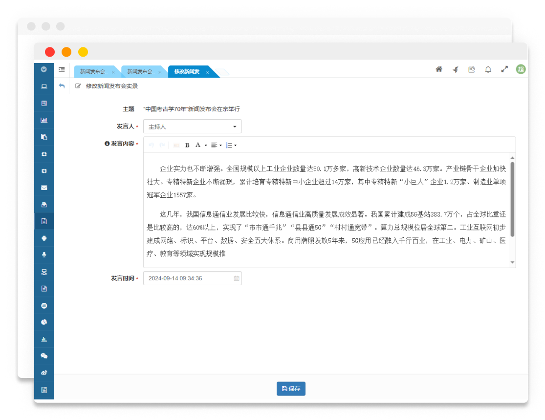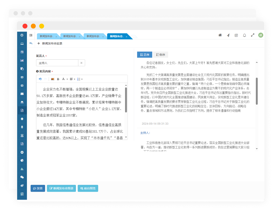 系統(tǒng)涵蓋新聞發(fā)布管理、發(fā)布會(huì)預(yù)錄管理、視頻直播與錄播、新聞圖文直播(實(shí)時(shí)推送)、網(wǎng)友提問(wèn)、相關(guān)內(nèi)容管理與分類管理、新聞發(fā)布會(huì)配置等功能模塊。支持圖文直播與視頻直播功能,并內(nèi)置文字敏感詞過(guò)濾功能,確保發(fā)布內(nèi)容的安全與合規(guī)。