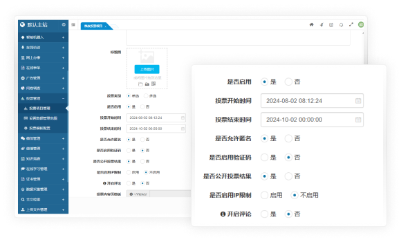 支持設(shè)定投票項(xiàng)目的報(bào)名開始與結(jié)束時(shí)間、投票開始與結(jié)束時(shí)間、是否公開投票結(jié)果、是否允許匿名投票、是否啟用驗(yàn)證碼、是否啟用IP限制和是否啟用評(píng)論等功能。
