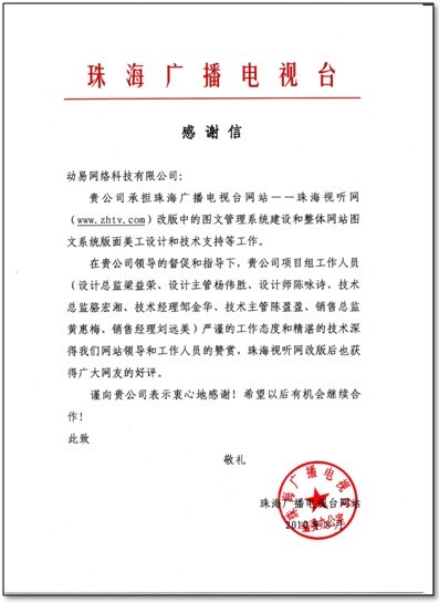 【動易8月12日訊】近日,動易公司收到客戶珠海電視臺發(fā)來的一封熱情誠懇的感謝信,信中表達(dá)了其對動易公司承建珠海廣播電視臺媒體新門戶——“珠海視聽網(wǎng)”工作的充分肯定。