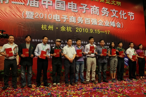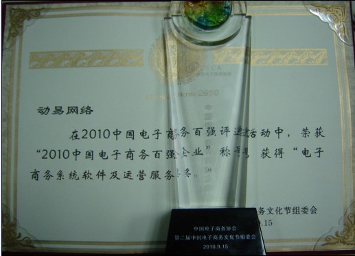 2010年9月15-17日,由中國(guó)電子商務(wù)協(xié)會(huì)和杭州余杭區(qū)政府主辦的“第二屆中國(guó)電子商務(wù)文化節(jié)暨2010中國(guó)電子商務(wù)百?gòu)?qiáng)峰會(huì)”盛大開(kāi)幕,會(huì)上揭曉了我國(guó)首個(gè)電子商務(wù)百?gòu)?qiáng)榜。動(dòng)易軟件作為國(guó)內(nèi)優(yōu)秀的一體化電子商務(wù)網(wǎng)站及網(wǎng)站系統(tǒng)整合解決方案提供商,與阿里巴巴、當(dāng)當(dāng)、卓越、李寧、京東等知名企業(yè)一道成功入選電子商務(wù)百?gòu)?qiáng)企業(yè),并榮膺“電子商務(wù)系統(tǒng)軟件及運(yùn)營(yíng)服務(wù)獎(jiǎng)十強(qiáng)”獎(jiǎng)項(xiàng)!