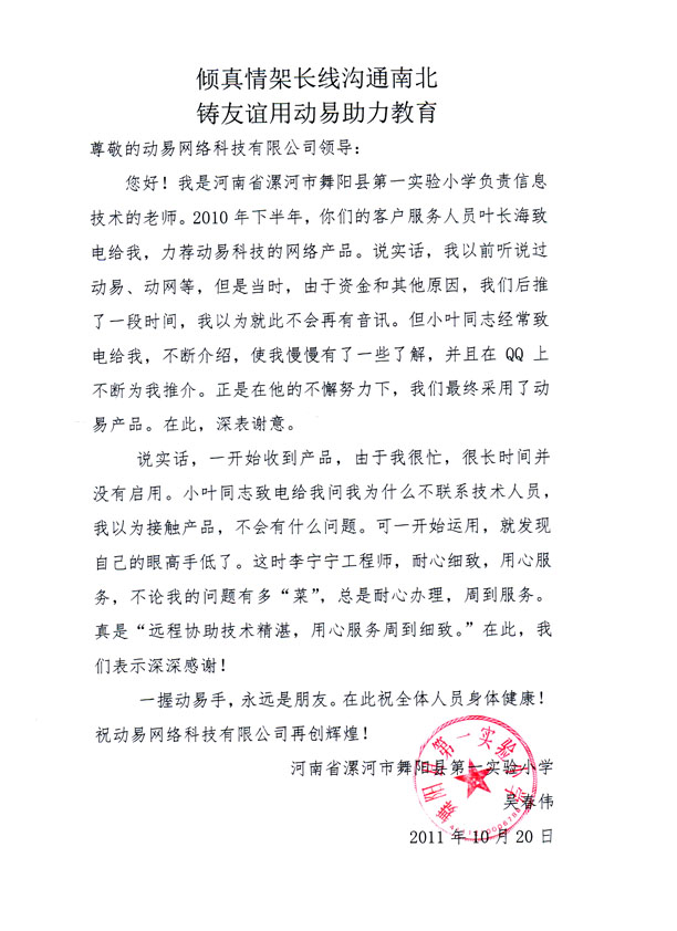 在標(biāo)題為“傾真情架長線溝通南北 鑄友誼用動(dòng)易助力教育”的感謝信中,客戶提到:不論我的問題有多“菜”,總是耐心辦理,周到服務(wù),真是“遠(yuǎn)程協(xié)助技術(shù)精湛,用戶服務(wù)周到細(xì)致”,在此,我們表示深深感謝。
