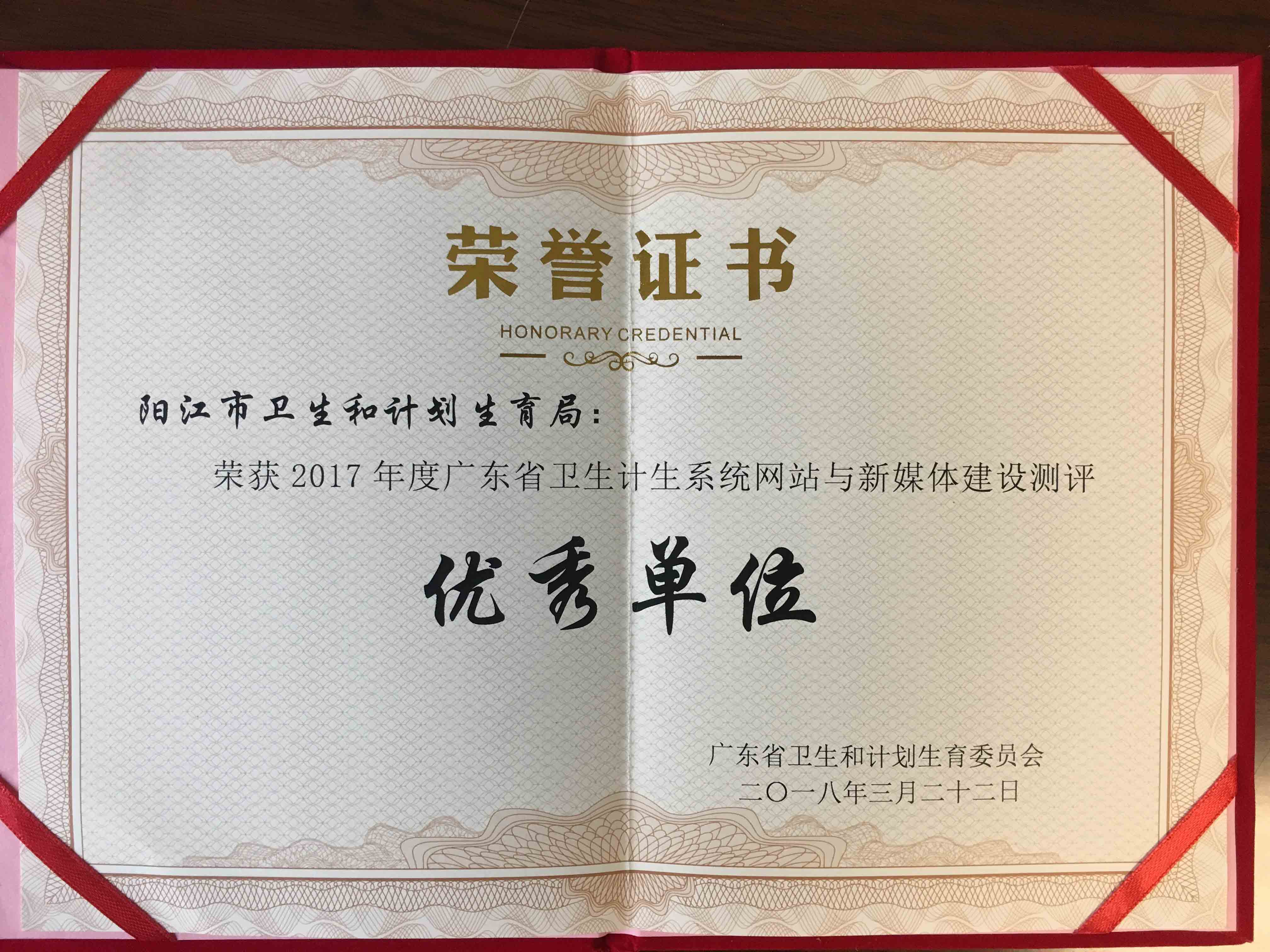 近日,廣東省衛(wèi)生計(jì)生委公布了廣東省衛(wèi)生計(jì)生系統(tǒng)2017年度網(wǎng)站與新媒體建設(shè)測評結(jié)果,陽江市衛(wèi)生和計(jì)劃生育局榮獲網(wǎng)站與新媒體測評優(yōu)秀單位稱號。