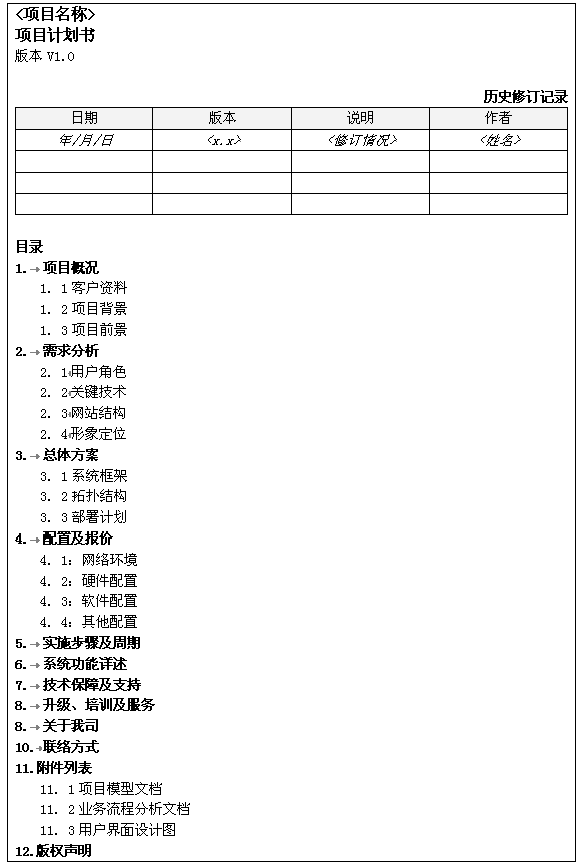 《網站策劃方案書》(《網上業(yè)務構建解決方案書》)一般包含以下內容: