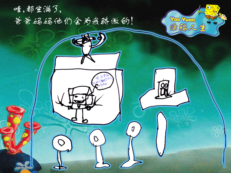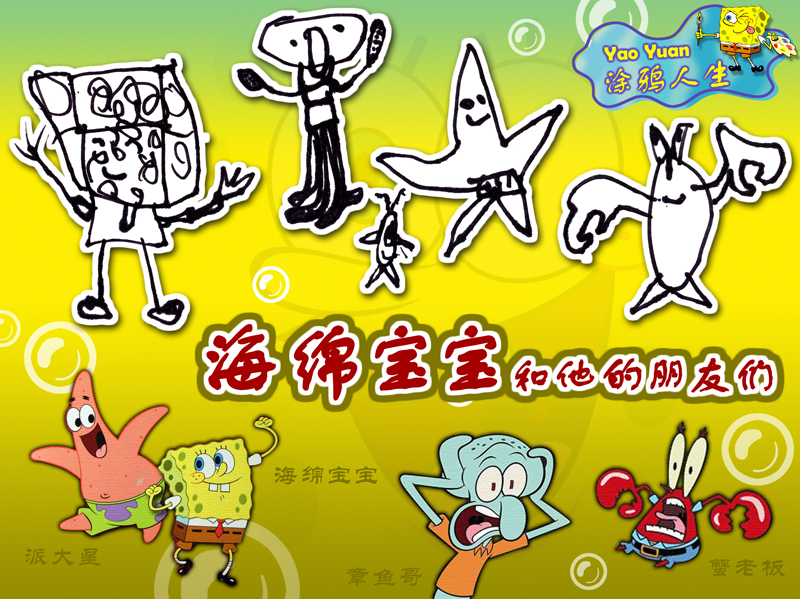 兒子看過了許多動(dòng)畫片,《海綿寶寶》就是其中百看不厭的一部。在看完電視后,電視中的主人公就成了他繪畫的對(duì)象,電視中的劇情就成了他繪畫的主題。上次收到LP寄來的這二幅畫,就是他看過這動(dòng)畫片后信手拈來的涂鴉:)孩子們都喜歡看動(dòng)畫片,因?yàn)樗麄儚闹锌梢韵硎艿皆S多美好、無厘頭的樂趣,這就是孩子純真的世界。