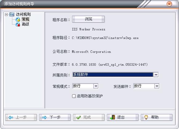 [2]在“常規(guī)”選項(xiàng)下,選擇程序:“C:\windows\system32\inetsrv\w3wp.exe”,在“所屬類別”選擇“系統(tǒng)軟件”(可選)