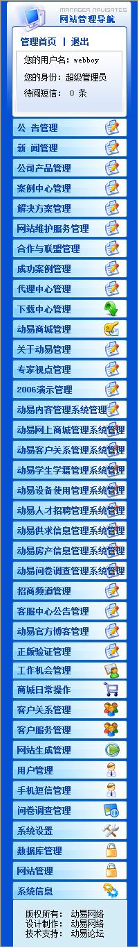 這樣的設(shè)計在頻道數(shù)目比較少時,還是比較清晰的。但是當(dāng)頻道數(shù)目一多時,超級管理員登錄后臺就會眼花繚亂的。大家看看動易官方網(wǎng)站的后臺就知道了。