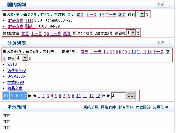 下圖是動易 SiteFactory 實現(xiàn)的同頁面多分頁標簽并存的示例,其中紅框標出的分頁標簽都能對自己的數(shù)據(jù)源標簽進行分頁,且互不干擾: