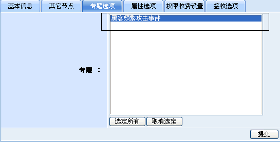 建立好專題后,在相關(guān)節(jié)點(diǎn)中添加新聞時(shí),若文章屬于黑客專題的范疇即可將這篇?dú)w屬于“黑客頻繁攻擊事件”專題(如下圖)。若之前已經(jīng)有相關(guān)的黑客文章需要?dú)w類到此專題,則可通過文章批量修改工具將文章統(tǒng)一歸屬于"黑客頻繁攻擊事件"專題就可以了。