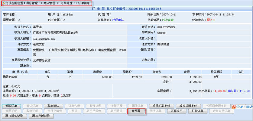 在動易eShop2007里,為顧客開發(fā)票是通過這個步驟進(jìn)行的:后臺管理——商店管理——訂單處理——訂單信息——開發(fā)票。