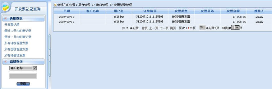 系統(tǒng)提供了快速查找功能,預(yù)置了一些常用查詢。除了可以通過時間進(jìn)行查詢之外,還可以對開票的類型進(jìn)行查詢,另外,在高級查詢功能中,商家可以指定“客戶名稱”、“開票人”選、“開票日期”,來進(jìn)行查詢,而不用從訂單中來查看開票的信息,極大的提高財務(wù)發(fā)票管理的效率。