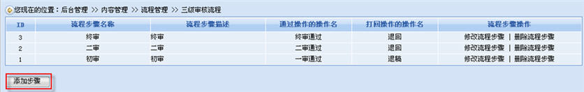 在添加步驟的頁面里,我們根據(jù)所設(shè)計的三級審核流程來指定該步驟的各種參數(shù),如:步驟名稱、可執(zhí)行本步驟的角色、哪種狀態(tài)的稿件可以執(zhí)行本步驟的操作、通過(不通過)該步驟的操作的命名、通過(不通過)該步驟的稿件狀態(tài)等。