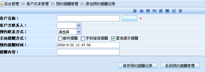 客戶關(guān)系的良好維護(hù)離不開客服人員持續(xù)不斷地定期跟客戶聯(lián)系,而如果企業(yè)客戶數(shù)量眾多,每個(gè)客服人員均需負(fù)責(zé)成百上千客戶的時(shí)候,便有可能發(fā)生不能很好地安排時(shí)間定時(shí)與每一位客戶進(jìn)行聯(lián)系,以致遺忘掉了其中某些客戶,造成客戶關(guān)系維護(hù)的中斷,最終造成客戶的流失。為了盡量避免這一情況的發(fā)生,系統(tǒng)提供了約約提醒功能,客服人員可以事先設(shè)置好與某位客戶的聯(lián)系預(yù)約信息、時(shí)間和需要提醒的方式;當(dāng)預(yù)約時(shí)間到了之后系統(tǒng)將自動(dòng)以客服人員事先設(shè)置的提醒方式提醒客服人員聯(lián)系客戶,提醒方式可以是郵件、手機(jī)短信或系統(tǒng)后臺(tái)將自動(dòng)彈出提示窗口提示。